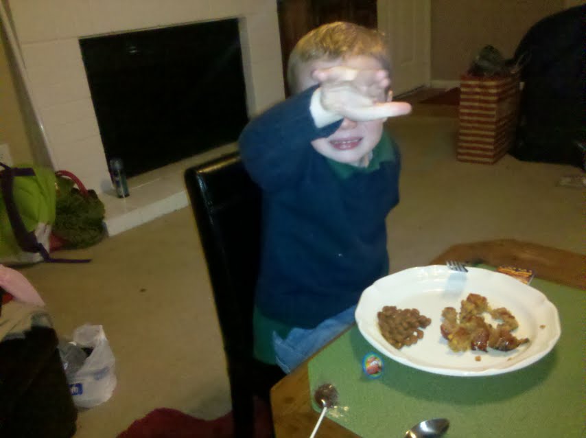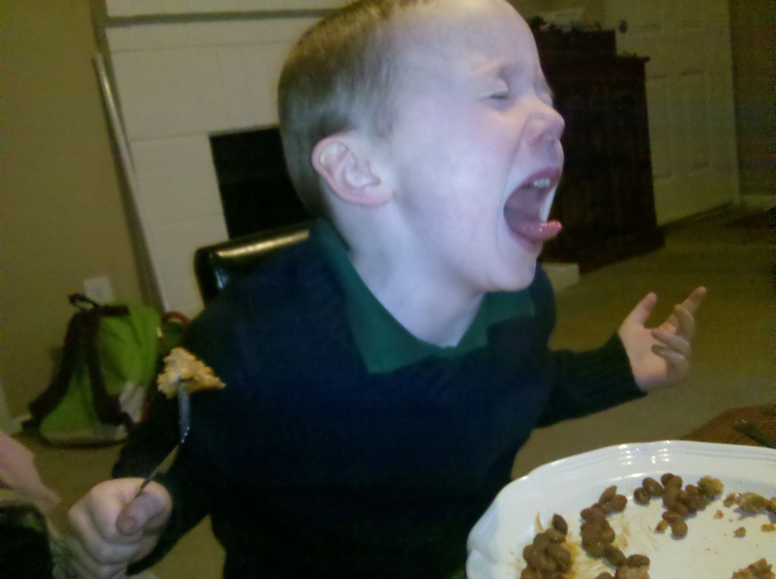 Prior to that, when I was insisting that he at least try more than the first bite he had put in his mouth, howling before he had even bitten down, “Mama, it tastes baaaad!” I got a picture of his truly sad face. He was grossed out by the meal, as was his father.