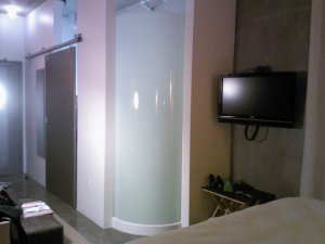 The bathroom itself wasn’t bad.  The shower was big and roomy, and the sink was a really nice, deep bowl that sat up on the granite counter.  However, the bathroom was only separated from the rest of the room by a glorified screen.  You had a good 3 feet of open space from the top of the sliding door/smoked plexiglass shower wall and the ceiling, meaning that when I was in the bathroom, I could converse with B easily.  I didn’t even have to raise my voice for him to hear me. So you can guess what else he could hear.  And vice versa.