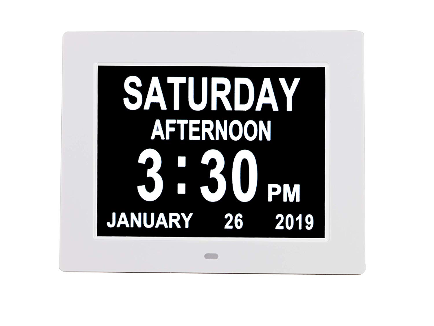 This clock would show her the Day of the Week, the Date, the Time, and the Time of Day.