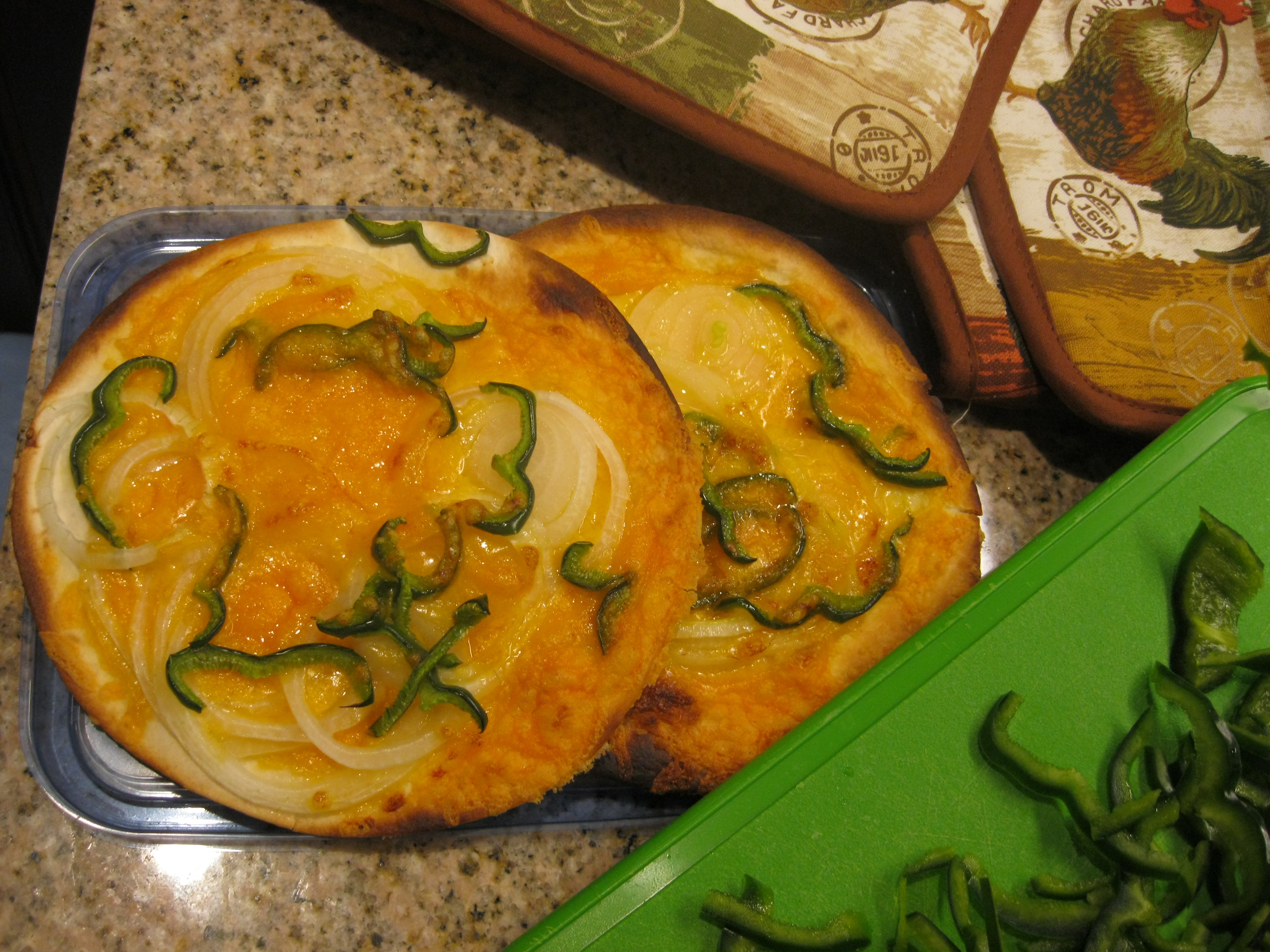 For lunch today, I sliced onions and poblanos, and layered them on tortillas with cheddar cheese. I sat these under the broiler until the cheese was nice and bubbly, and served with Ranch style dressing. Mmmmm.