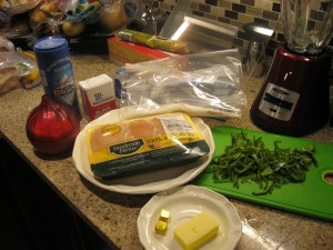 What you need: 3 large chicken breasts, 2Tbs of flour and 1/2 Tbs of paprika in a huge ziplock baggie, 2 poblano peppers, 1 small onion, 3 Tbs butter, salt & pepper, 1 cup chicken stock or 2 bouillon cubes cooked in 1.5 cups of water.