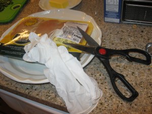 I do NOT touch raw meat, so I always have gloves when I am cutting up my chicken. I use kitchen scissors to cut it into small cubes.