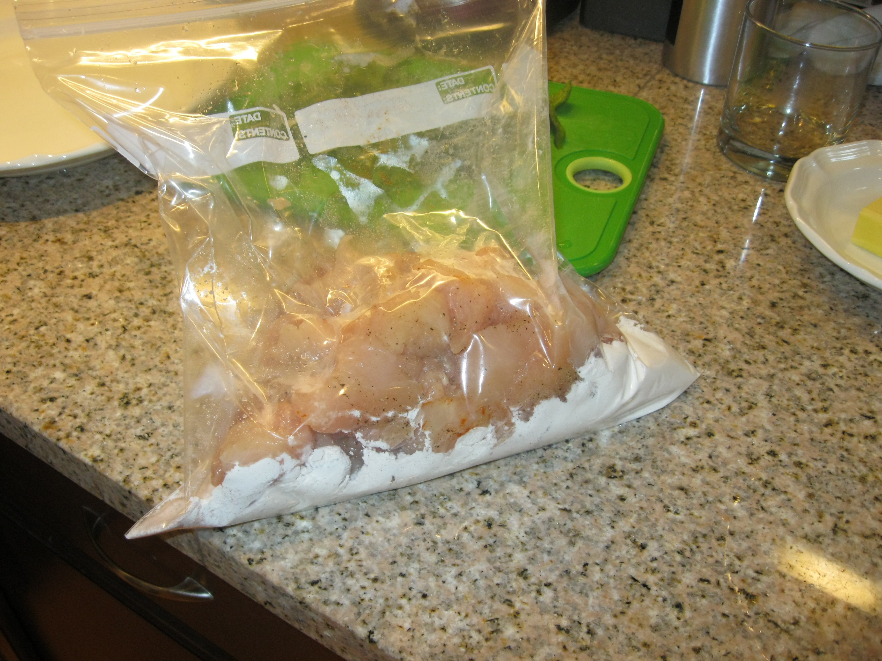 Once it is cubed, salt and pepper over your chicken, then drop it all into the ziploc of flour and paprika. Shake it! Shake it more! Shake it like the rent is due!