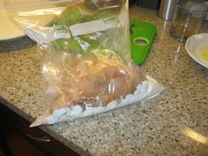 Save your baggie when you dump out your chicken. You can use it as a garbage baggie for the chicken scraps you cut away (I cut away all tendons and anything that looks like gristle–I won’t eat that!) and for your onion skins. Zip it up and you can throw it in the trash can without worrying about the odor.