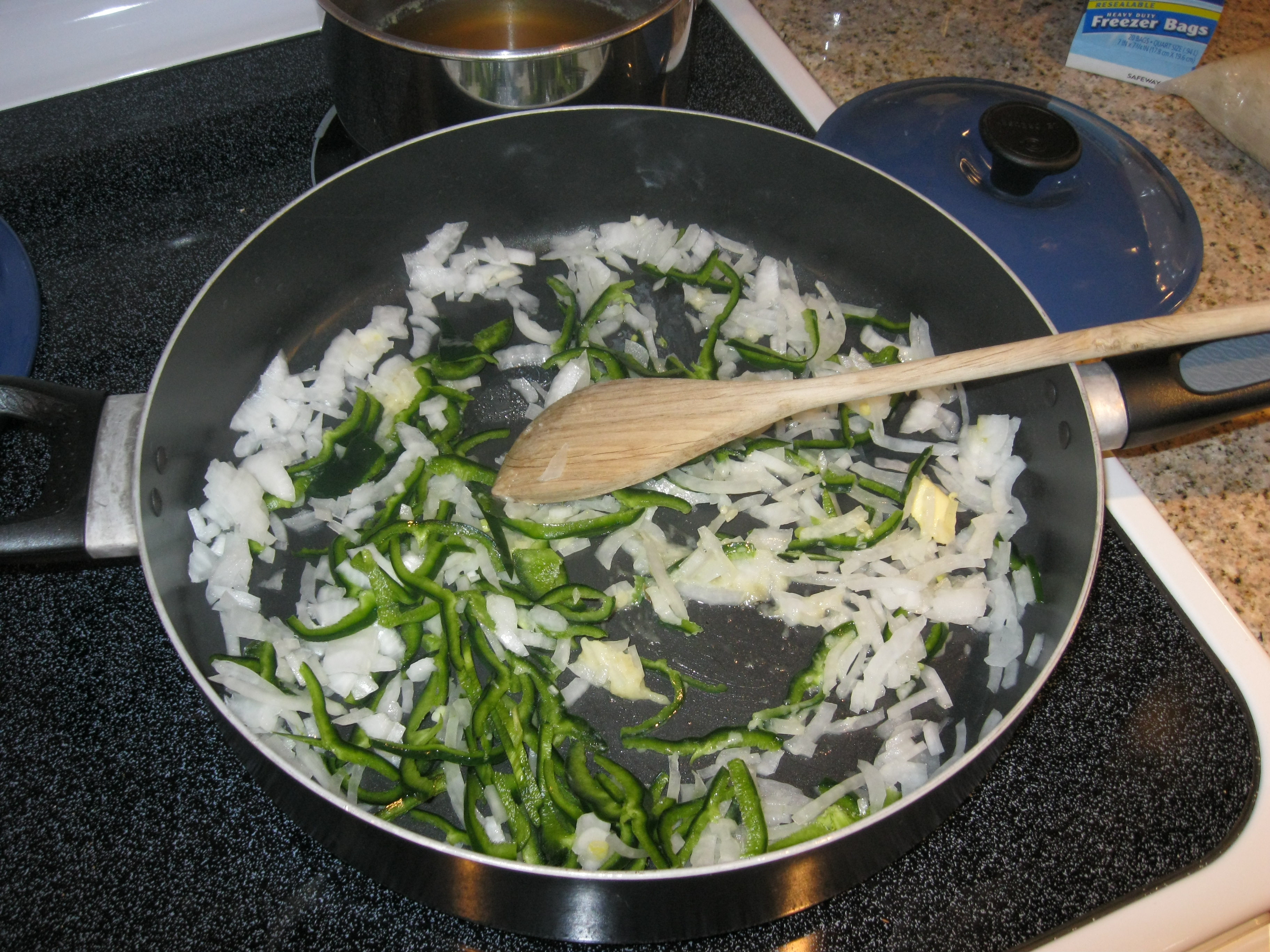 Use 1/2Tbs of butter to saute your finely chopped onions and peppers. Cook until the onions are transparent. I also threw in some garlic because it sounded like a good idea. When the veggies are cooked, remove them from the skillet. I used scissors to chop them down even further.
