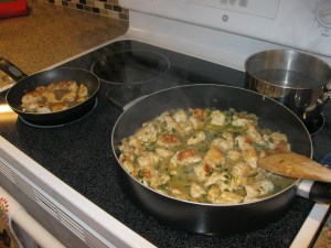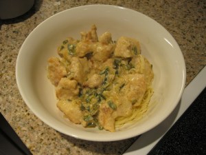 You’ll use 2.5 Tbs of butter to brown your chicken in, over a medium heat. I cooked mine about 5 minutes on each side. Then, I separated out chicken for Thor, in 1/2 cup of chicken bouillon. He hates peppers, and I didn’t want to overwhelm him with the spice. I added the peppers/onions/garlic back to the main skillet, and the remaining bouillon. I cooked this down on low until the bouillon was nearly gone, then I added 1/2 cup of sour cream to the big skillet, and a couple of Tbs to the little one. Mix mix mix. While this was cooking, I cooked some angel hair pasta.