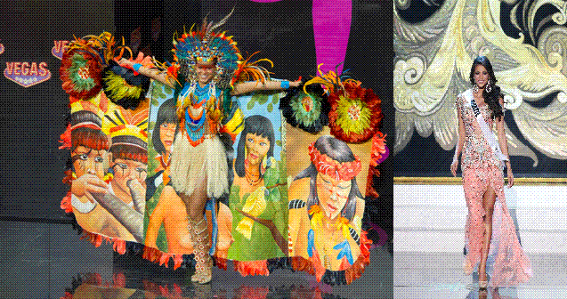 I do love some fringe. The judges must have too because here is 1st Runner Up, Miss Spain. I’ll tell you right here and now, once Miss USA was out of the running, Miss Spain was my pick of the pack–but I knew she wouldn’t win. She was too sweet looking to win–didn’t have enough edge to her. I thought she had the prettiest, brightest smile, and she was poised and graceful without looking haughty. And also, fringe! I just loved her National Costume.