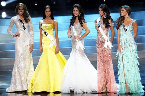The last ladies standing were Miss Brazil, Miss Ecuador, Miss Philippines, Miss Spain, and Miss Venezuela. As you can see, the competition was fierce. From the swimsuit competition, the ladies go on to evening gown, where they are whittled down to 5, then they hit their marks for interview. No one knows better than I do how quick an interview question can kill your shot at the crown! But, a bad evening gown can hurt you, too.