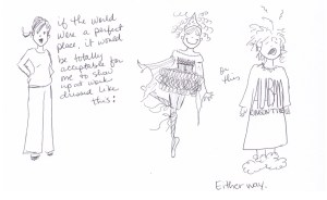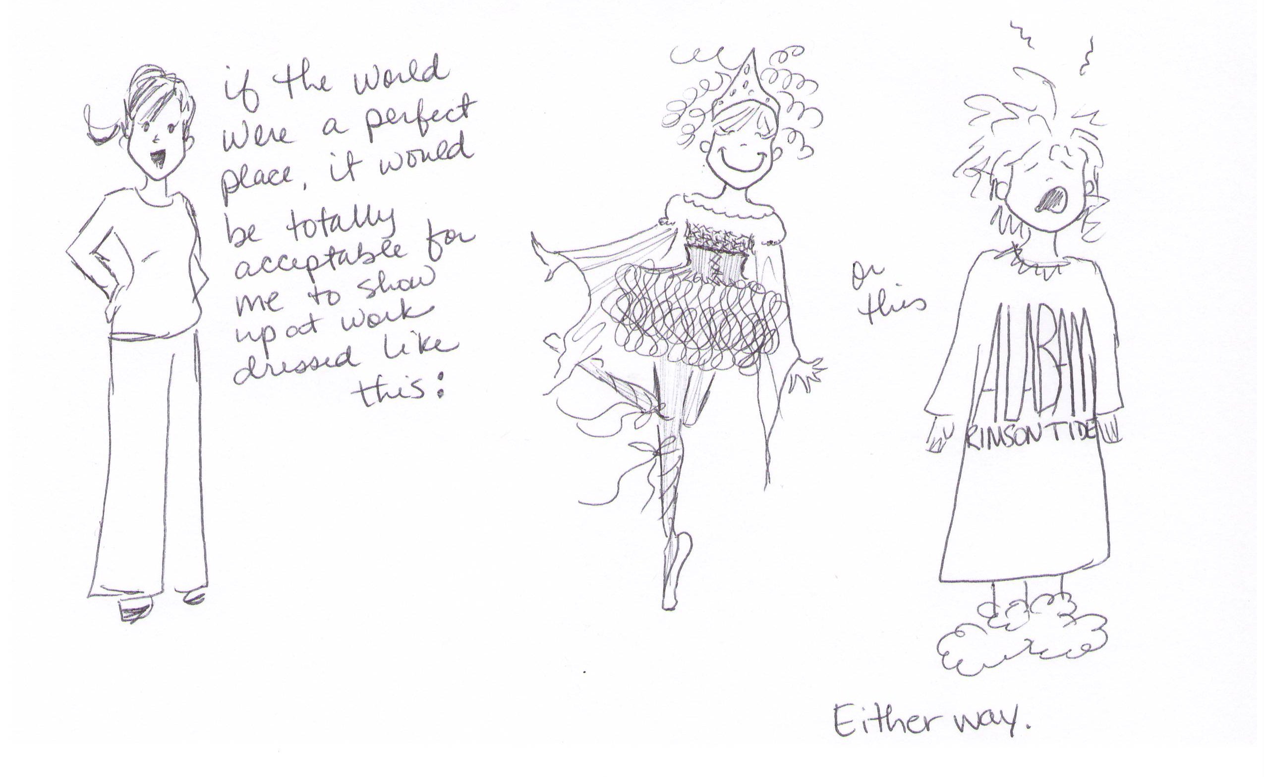 I was thinking about how my childhood incarnation had figured out a career path that involved being a supermodeling attorney, who was also the trapeze act in the circus, and a Cher-like pop-icon on the weekends. That would have made for some interesting wardrobe changes.