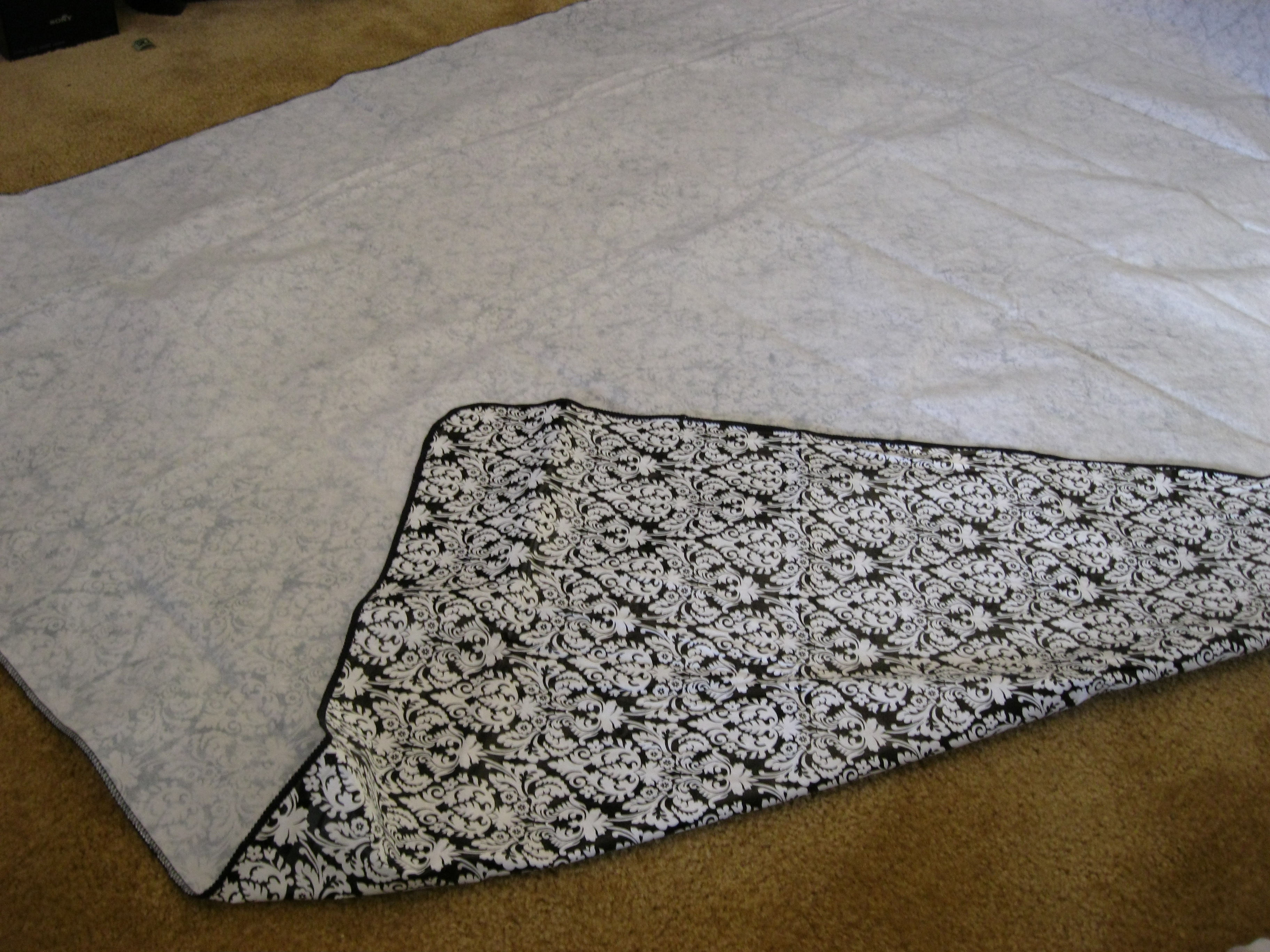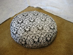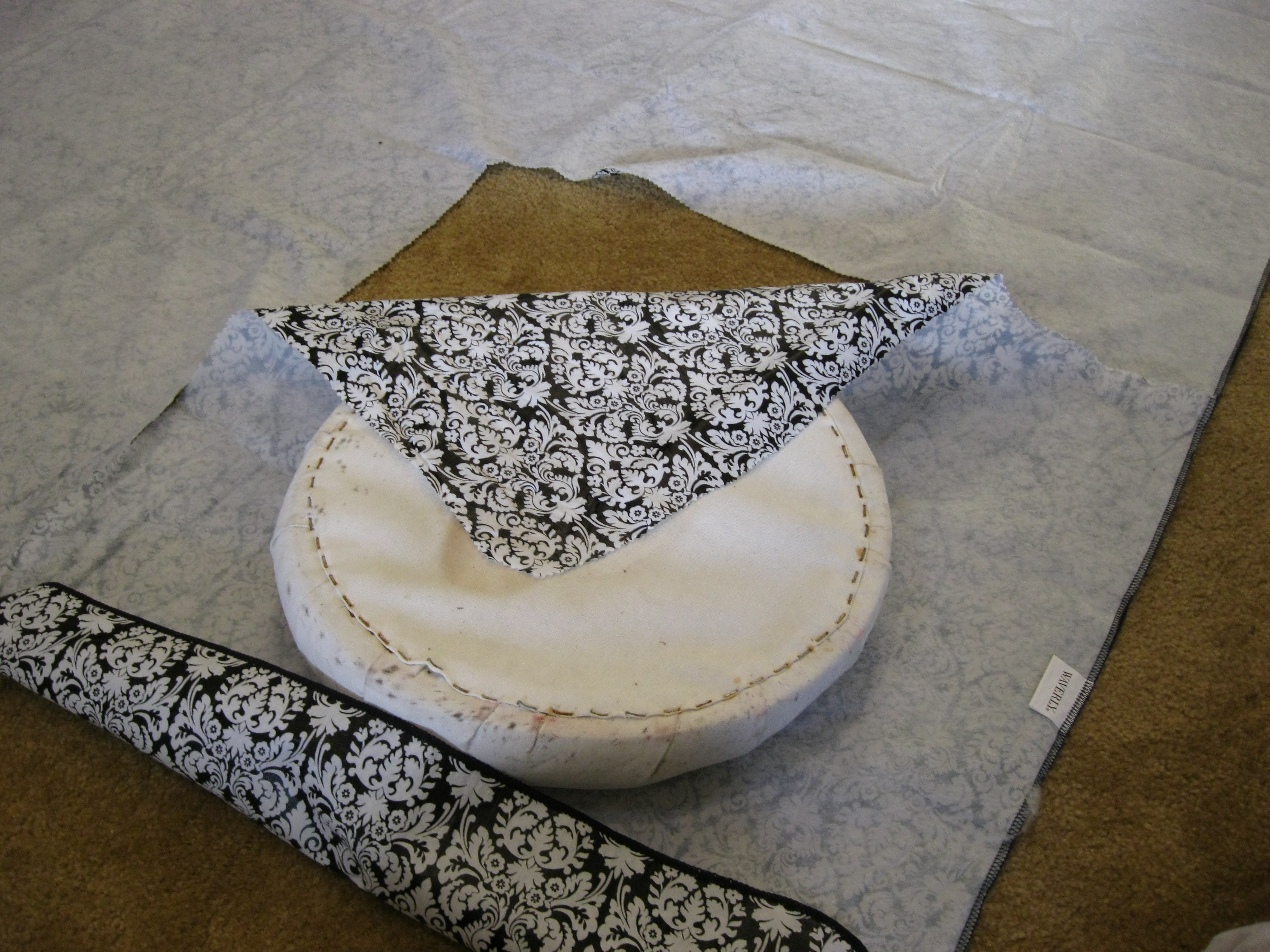 I plopped a seat cushion down in the corner of the tablecloth (60″x120″ sized rectangle), and started cutting as though I were wrapping a Christmas present.