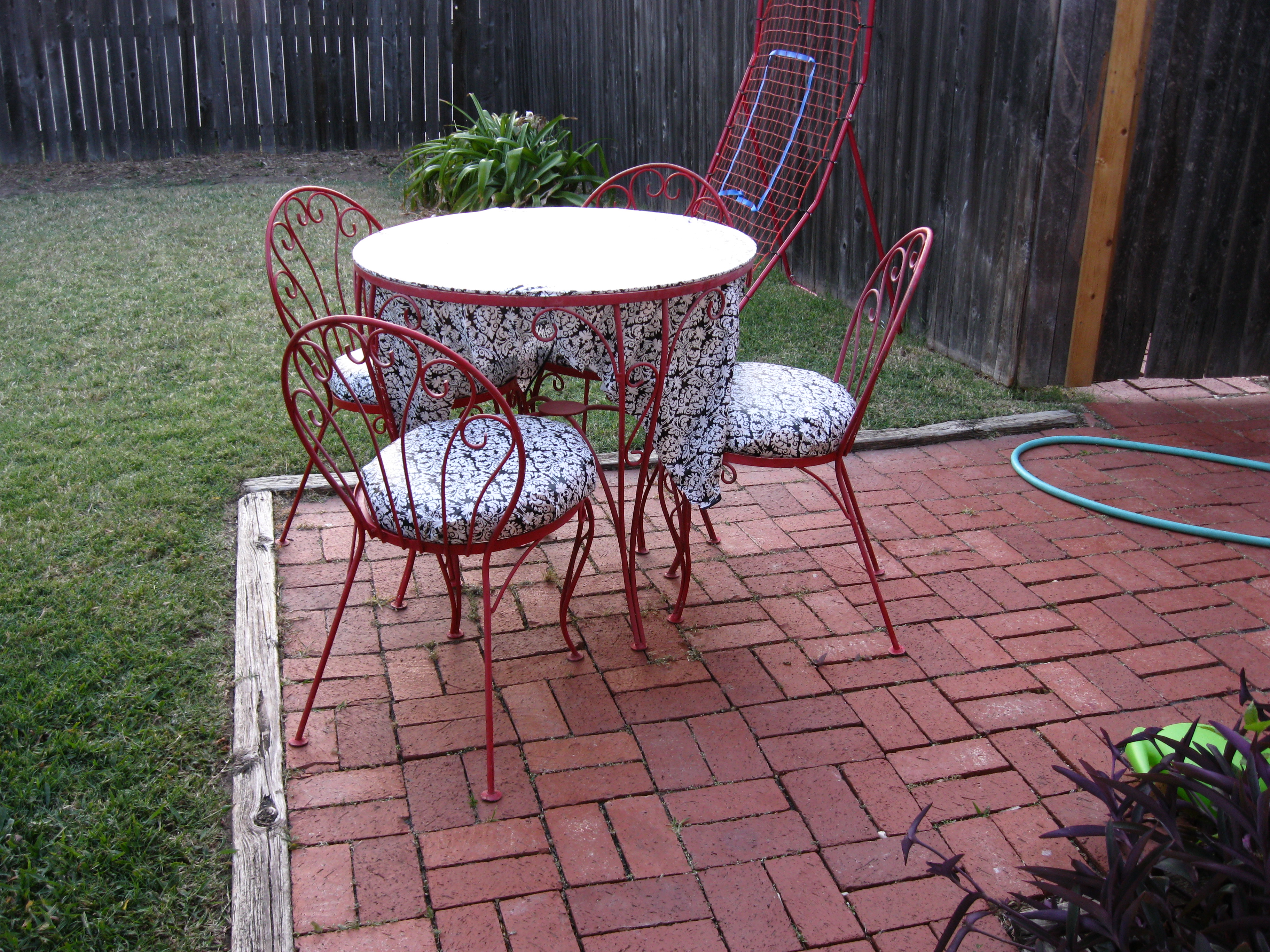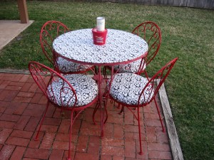 When I married Bryan, I inherited this adorable cafe table and chairs.  B’s mom lovingly, and carefully painted it bright red, and covered the seats in red and white canvas for us, and it was truly a great set.  But, years in the sun faded out the canvas, and then a year in storage didn’t do much for the fabric.  It was high time to recover the seats, especially since I have a little party coming up this weekend.