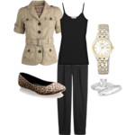 Having some issues loading photos today, so if you’re interested in this morning’s polyvore set, you can find it here. Today it’s the short sleeved, safari jacket worn over an opaque, black camisole and peg leg trousers, with leopard print, maryjane ballet flats. For accessories, I have on a two toned, round face watch and my wedding set. No earrings today. I was feeling lazy.